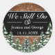 TODAVÍA HACEMOS pegatina boda. Madera rústica marrón, fondo de nieve y bosque nevado. Acogedor estilo rústico vintage. Hay más artículos disponibles en este estilo en nuestra tienda. Puede editar el diseño más adelante, cambiar colores, fuentes y añadir texto extra haciendo clic en el enlace "personalizar más adelante".