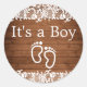 Pegatina Redonda Madera rústica y encaje blanco, es un chico