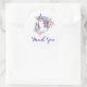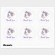 Gracias pegatinas con un elegante ilustracion acuarela que presenta una madre acuarela y un bebé unicornio con mané morado y pavo. Delicadas flores naranjas rodean al par.