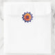 Dieses atemberaubende Mandala im Blütenstil vereint harmonisch die Farben Blau, Orange, Lila und Pink, um ein fesselndes visuelles Erlebnis zu schaffen. Das Mandala ist kunstvoll auf einem runden Sticker abgebildet und besticht durch seine detaillierten, symmetrischen Muster, die wie zarte Blütenblätter anmuten und in der Mitte des Designs zusammenlaufen. Die sanften Farbübergänge zwischen den kühlen Blautönen und den warmen Orange-, Lila- und Pinknuancen verleihen dem Mandala eine beruhigende und zugleich energetische Ausstrahlung.