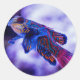 Mandarin Goby Fish Classic Round Pegatina. El pescado Goby Mandarin es uno de los peces más bonitos del mar. Todo su cuerpo es una combinación vertiginosa de rayas azules, verdes y naranjas. Foto de David Clode.