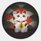 Un gato japonés con suerte, ilustrado por Megan Anderson. El kanji de la moneda representa "longevidad".