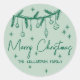 Pegatina redonda de fiestas navideñas. Esta alegre pegatina redonda presenta un conjunto de doodles de vegetación de pino y adornos colgantes en la parte superior, con estrellas dispersas que añaden un toque juguetón. Sobre un fondo verde salvia claro, "Merry Christmas" aparece en elegante letra cursiva verde esmeralda cerca del centro, mientras que un nombre o línea de texto se muestra en la parte inferior en una fuente verde esmeralda limpia.