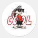 Un conejo personalizado vestido con una camiseta roja, pantalones cortos negros y gafas de sol oscuras se mantiene confiado con las manos en los bolsillos. La palabra "GUAY" está claramente escrita en rojo detrás del conejito, destacando su actitud relajada y elegante. El fondo negro purpurinoso añade un efecto divertido y vibrante al diseño general.