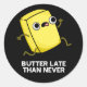 Butter Late Than Never Funny Food Pun presenta una pequeña losa de mantequilla que llega tarde. Perfecto regalo de juego de palabras para la familia y amigos que aman los juegos de palabras de mantequilla de comida.