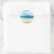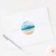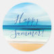 La temática tropical de la playa costera es náutica. Un cielo azul claro, el mar y una playa de arena. Guión con letras modernas y a la moda y texto: ¡Feliz verano! Letras azules.