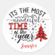 Maravilloso tiempo del año Plaid Tree Christmas sticker con nombre personal o apellido. El diseño es muy bonito y tiene un árbol de Navidad repleto de letras de guión, copos de nieve y estrellas.