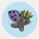 Bicho de ladrillo con alas moradas listo para el Mardi Gras con una máscara colorida y perlas.