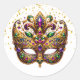 This large size round sticker is shown in a Mardi Gras celebration mask print design.