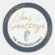 Nuestro pegatina personalizado de color azul marino y oro "Seas & Greetings" es un bello toque final a sus regalos y sobres de vacaciones. El diseño es la elegancia náutica perfecta, con su tipografía de acuarela dorada, un delicado caballito de mar de color azul y corales de oro a juego. Personalice fácilmente con su nombre o apellido. #SeasAndGreetings #Nautical