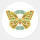 Una mariposa monarca decorada con nudos celtas y espirales en tonos dorados, naranjas y verdes.