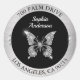 Personaliza esta etiqueta adhesiva de dirección de devolución de mariposa de diamantes con tu nombre y dirección en metal plateado con fondo de círculo negro y círculo gris con texto en negro y blanco. Haz clic en “Personalizar” para cambiar los colores y estilos de letra.
