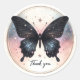 Estos pegatinas cuentan con una mariposa bellamente ilustrada con un tema cósmico, rodeada de estrellas y galaxias, dentro de un borde circular. Debajo de la mariposa están escritas las palabras "Gracias".