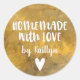Un pegatina "casero con amor" personalizado con un corazón blanco sobre un fondo de mármol dorado en textura. Hazlo tuyo añadiendo tu propio nombre. Un toque de bonito para todos tus regalos caseros. Diseñado para ti por Blackberry Boulevard.