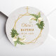 Este elegante diseño floral de bautismo recomendado para el bautizo de una niña tiene un marco dorado geométrico irregular con ramos de flores de calas blancas y helechos hacia arriba y hacia abajo sobre dos hexágonos dorados que se superponen, con una cruz dorada en su parte superior. El fondo es de mármol blanco. El nombre del niño está escrito en una elegante letra caligráfica; el resto está escrito en mayúsculas. Todo el texto tiene un color amarillo dorado, como el marco dorado.