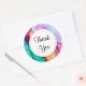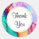 Gracias pegatinas con un diseño artístico abstracto elegante. Pintura acuarela con colores que mezclan y mezclan creando un bonito patrón de mármol fluido. Un marco blanco con un borde falso de Relieve metalizado dorado sobre el techo con tu texto personalizado escrito en el interior.