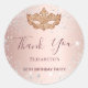 Un pegatina para una fiesta de cumpleaños número 50 (o de cualquier edad) glamurosa y femenina. Un fondo dorado subió decorado con finos destellos de plata y una máscara dorada de máscaras. Personalice y agregue un nombre y una edad. El texto: Gracias está escrito en oro rosa oscuro con un gran guión de estilo moderno con letras a mano.