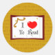 Esto me encanta leer el diseño presenta un libro antiguo encuadernado por la izquierda con acentos de filigree dorado con escritura que dice "Me encanta leer" junto con un corazón rojo brillante. Este diseño de lectura está dedicado a los amantes de las librerías, a los libros, a los nuevos lectores, a los bibliófilos, a los bibliotecarios, a los amigos de la biblioteca y a cualquier otra persona que se haya visto atrapada en un gran libro.