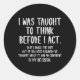 Pegatina Redonda Me Enseñaron A Pensar Antes De Actuar Con Sarcasmo