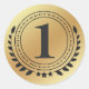 Un elegante pegatina ganador de medallas de oro en primer lugar con laurel circular, hojas y estrellas alrededor de un número 1. También puede cambiar el número para adaptarlo a sus necesidades. Fijado sobre un fondo de gradiente dorado. Reconocimiento de la grandeza de alguien. ¡Hooray!