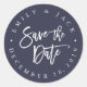 Moda y moderno guardar la fecha pegatinas de la fecha en el texto circular "guardar la fecha" en tipografía de pincel con letras blancas. El fondo azul de la medianoche es llamativo y elegante para una forma perfecta de terminar su guardado de los envíos de fechas!