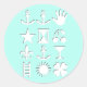 Algunos pequeños diseños con mano, ancla, cereza y más con fondo azul pálido y pequeña sombra de caída. Diseño en pegatina redondo.
