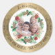 "Feliz Relieve metalizado dorado navideño Wreath Photo Return Address Classic Round Pegatina." Elegante Relieve metalizado dorado (foto de alta calidad de oro real) fondo con caligrafía de guión texto personalizar. Selle sus Navidades y tarjetas de vacaciones con su foto familiar rodeada por una corona floral con encanto y Navidades clásicos, y su nombre y dirección de retorno. Arte pintado en acuarela por Audrey Jeanne Roberts, artista y diseñadora con licencia internacional, copyright.