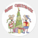 Dos ratones de vacaciones lindos, uno con un bastón de caramelo y otro con un regalo parado frente a un árbol de Navidad con el texto 'Feliz Navidad'.
