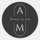 Estos pegatinas minimalistas de monograma boda de 3" presentan las iniciales de la pareja de bodas en blanco sobre un fondo negro, bordeado por una forma oval con la fecha boda centrada entre