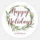 Minimalista Happy Holidays Watercolor Pine y Berries Wreath Pegatina redondo clásico. Personalice agregando su apellido y disfrute!