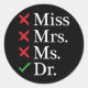 Pegatina Redonda MISS MRS. MS MÉDICA humor DR PhD