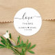 pegatina blanco de moda por tus favores matrimoniales y gracias a las tarjetas que incluyen "amor + gracias" en letras modernas y simples y un guión elegante con toques, tus primeros nombres unidos por un corazón y tu fecha boda.