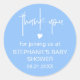 Una pequeña ducha azul para bebés favorece a un pegatina con un corazón lindo y un tipo de letra minimalista. Perfecto en bolsas, cajas o botellas, viene en una variedad de tamaños. NB: La palabra 'gracias' no es editable.