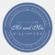 Moda, moderno y sencillo retorno boda negro y blanco se dirige al pegatina redondo clásico con el texto el futuro Sr. y la Sra. en blanco elegante caligrafía de escritura sobre un fondo azul clásico. Simplemente agrega tu nombre y dirección. Diseñado exclusivamente para usted por Happy Dolphin Studio. Si necesita ayuda o productos coincidentes, póngase en contacto con nosotros en happydolphinstudio@outlook.com. ¡Estamos encantados de ayudarle a hacer de su boda el día más hermoso!