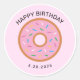 Esta encantadora y bonita moda, que parece un pegatina de cumpleaños, con un encantador personalizado de donut marrón, decorado con una cubierta rosada y rociadas de colores, y un personalizado de texto de feliz cumpleaños y de fecha en un fondo personalizado rosa claro dentro de un círculo decorativo blanco, es una buena elección para tu cumpleaños especial, eventos de duchas de bebé, etc. Personalizar que sea especial.