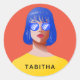 pegatina redondo clásico de moda roja con una mujer elegante, cabello y gafas azules, y nombre de personalizable. Para cartas de moda, regalos, para escuela y oficina.