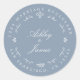 Moda, retorno boda moderno y sencillo se dirige al pegatina redondo clásico con el texto el futuro Sr. y la Sra. en blanco elegante con un polvoriento fondo azul adornado con laureles y otros detalles decorativos rústicos. Simplemente agrega tu nombre y dirección. Diseñado exclusivamente para usted por Happy Dolphin Studio. Si necesita ayuda o productos coincidentes, póngase en contacto con nosotros en happydolphinstudio@outlook.com. ¡Estamos encantados de ayudarle a hacer de su boda el día más hermoso!