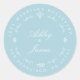 Moda, retorno boda moderno y simple se dirige al pegatina redondo clásico con el texto el futuro Sr. y la Sra. en blanco elegante sobre un fondo de brillo azul adornado con laureles y otros detalles decorativos rústicos. Simplemente agrega tu nombre y dirección. Diseñado exclusivamente para usted por Happy Dolphin Studio. Si necesita ayuda o productos coincidentes, póngase en contacto con nosotros en happydolphinstudio@outlook.com. ¡Estamos encantados de ayudarle a hacer de su boda el día más hermoso!