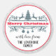 Moda y festividad Feliz Navidad pegatina redondo clásico con un purpurina plateado que brilla el borde y el fondo blanco. Las palabras "Feliz Navidad" están escritas en un audaz guión rojo. El pegatina está decorado con un diseño gris, algo rápido y de fantasía, con un árbol de Navidad, dos renos y canos. Al final del pegatina están las palabras "con amor de" en gris, y el apellido de su familia en negro.
