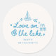 Modern Blue Script Lake Bachelorette Party Classic Round Sticker. Elegant and modern, blue and light beige "love on the lake" bachelorette party stickers, designed with script lettering, and cute doodles. Personalize with the bride's name below.