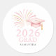 Celebrate your 2026 graduate with this pink and gold graduation round sticker featuring a blush grad cap, gold tassel and sparkling fireworks. A modern, elegant design perfect for a stylish high school or college grad celebration.