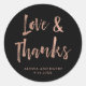 Estos stickers de boda modernos y frescos presentan un moderno guión de oro falso rosa escrito a mano que dice "amor y agradecimiento" en un rico fondo negro.