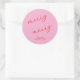 Esta pegatina redonda rosa de Navidad con letra manuscrita roja en negrita es una forma festiva y elegante de añadir un toque final alegre a tus regalos de vacaciones, favores de fiesta, sobres o envases de temporada. El diseño moderno presenta la frase juguetona "merry merry" en una letra roja fluida sobre un fondo rosa vibrante, creando un aspecto moderno y alegre que destaca durante la temporada navideña. Su diseño limpio con texto personalizable en la parte inferior te permite incluir el nombre de tu familia, saludo de vacaciones o mensaje corto, lo que hace que cada pegatina sea única y personal. Perfecta para sellar tarjetas de Navidad, decorar regalos de Navidad o añadir encanto a golosinas caseras, este diseño versátil combina una paleta de colores contemporánea con tipografía simple pero llamativa. Ya sea que se utilice para celebraciones personales o para la marca de vacaciones profesionales, esta pegatina elegante y festiva captura el espíritu alegre de la temporada de una manera divertida y moderna que es práctica y elegante.