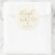 Moderno Boda minimalista Gracias Regalos Clásicos Pegatina Redondo, en escritura romántica, corazón lindo, con firma de novios y novios y fecha boda, tema dorado amarillo.