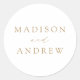 Selle sus sobres de invitación o favores con nuestros elegantes pegatinas de boda. Los pegatinas de boda personalizados muestran sus nombres en un guión de caligrafía dorada con un fondo blanco. Diseñar coordenadas con nuestra colección de bodas Modern Elegance.