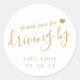 La ducha de bebé diseñada por un personalizado, la ducha de novia y la graduación favorecen a los pegatinas/etiquetas redondas que incluyen "Gracias por pasarse" en caligrafía moderna a mano con diseño cardiaco purpurina dorado.