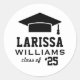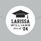Los pegatinas de personalizado en la ronda de graduación presentan un diseño en blanco y negro (¡se puede modificar a través de "Personalizar It!") con un tapón de graduación y texto personalizado para el nombre del graduado y el año de clase.