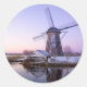 Pegatina redonda con molino de viento durante un amanecer morado en invierno con una delgada capa de nieve y hielo en el agua en el sitio de la UNESCO Patrimonio de la Humanidad, Kinderdijk en los Países Bajos.
