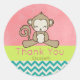 Un pegatina de agradecimiento que puede personalizar con su nombre u otro texto como gracias por venir a mi fiesta o su nombre de empresa. Un lindo ilustracion personalizado de un adorable mono marrón sentado. Ella tiene mejillas rosadas ruborizantes para mayor cortesía kawaii. Diseño divertido y caprichoso. Sobre un fondo compuesto por una textura rosa de color afeitado y un patrón de chevron verde azul con el texto sentado sobre una franja de banner verde lima.