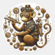 Un mono de inspiración steampunk vestido con intrincada ropa mecánica. El mono lleva gafas, un chaleco y un pequeño sombrero superior, mientras sostiene un complejo dispositivo mecánico que se asemeja a una pistola de rayos. A su alrededor están los engranajes, tuberías y otros elementos industriales, creando una rica y detallada estética de steampunk. Los tonos dorados de las partes mecánicas contrastan con la piel natural, mezclando temas orgánicos y mecánicos.